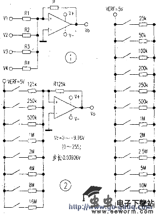 当VI=V2=V3=V4=V时。如果令Rl=,则Vo=-V(1+2+4+8),构成的是二进制数模转换器。当然,电阻个数还可增加,以构成更多位的转换器。