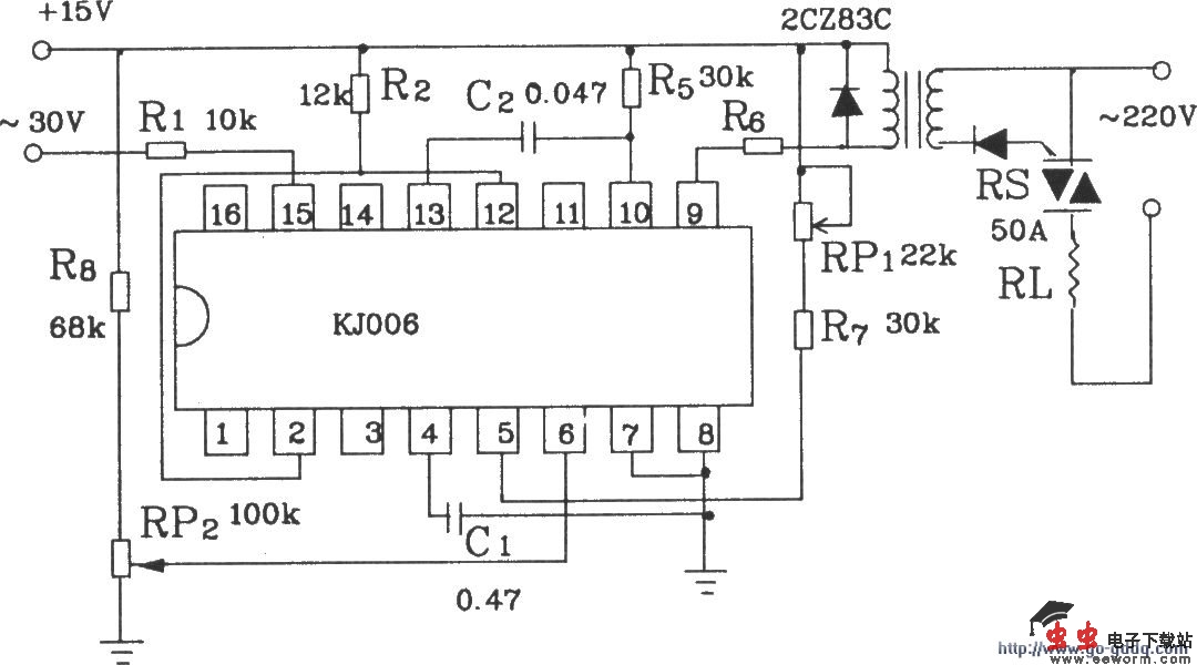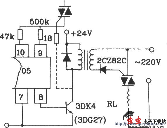 各点波形图 扩展电流时如果采用交流供电,3DK4集电极接18Ω电阻到可控硅控制极;直流供电时3DK4集电极接脉冲变压器。 用直流供电时KJ006的电路如下图所示: KJ006直流供电时的接线图 直流供电的扩展电流电路如图所示: 输出电流扩展时的接线图