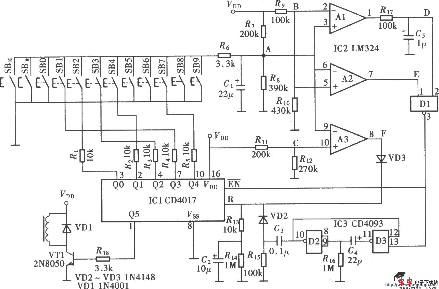 如图所示的密码锁电路由数字电路与运算放大器共同组成,其中由运算放大器组成的电压比较器来识别伪码。全电路由12个输入按键、一个密码控制电路、一组伪码识别电路、一个操作限时电路和开锁电路组成。