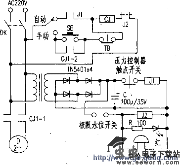 挖口井、建水塔、在厨房及卫生间安装自来水管和安装全自动及手动抽水系统。选择一个水源丰富的地理位置先打一口井,与此同时修建一个水塔,该水塔大小要根据日用水量设计成合适的大小,并从井中把水抽上后要有过滤,消毒再过滤后接入家用自来水管,供日常生活所用。当水塔中的水降到一定深度时,能自动启动潜水泵抽水至水塔中,而且设有低水位启动,高水位停止,最高水位声光报警,并使水塔中的水位保持在一定范围内。另外也可以手动供外界用水。本系统实现电路见附图。