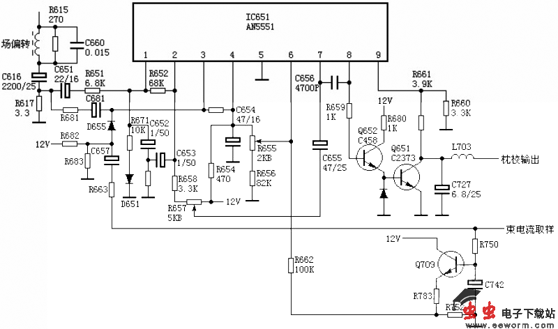 R655为行幅调节电位器,R657为枕校调节电位器。