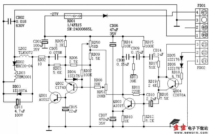 场锯齿波电压经PD02的(3)脚、RD17、CD14、RD16、RD19、CD10送到QD03的B极。QD04为50Hz/60Hz切换电子开关,在50Hz时,QD04截止,而在60Hz时,QD04导通,RD19被短路,送到QD03B极的锯齿波幅度增大。