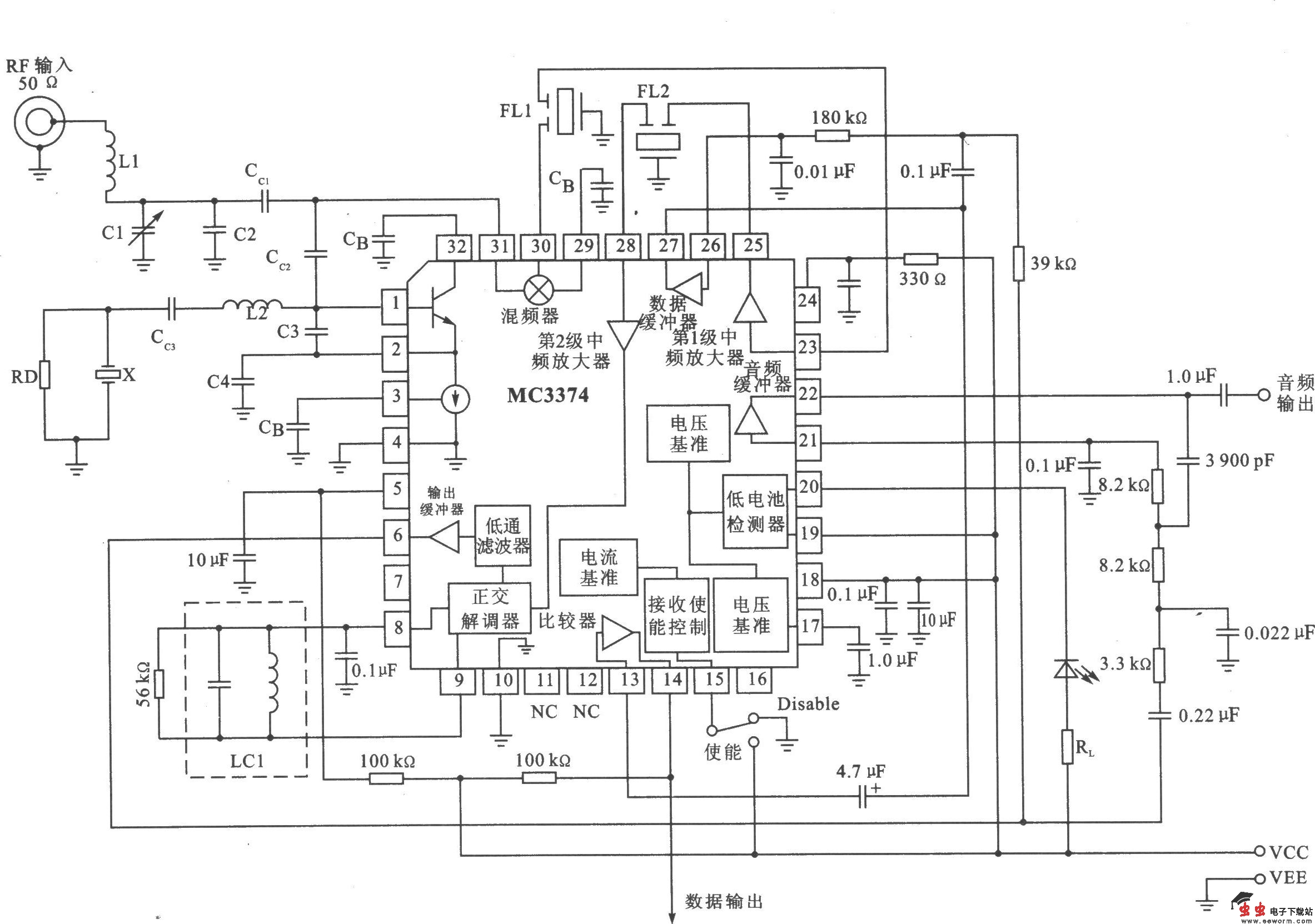 MC3374/D是窄带音频和数据低功耗接收器。芯片中的2个缓冲放大器允许音频和数据 同时接收。MC3374/D在电池电压等于1.1 V时仍能工作。 主要技术特点如下: ·输入带宽为75 MHz; ·FM/FSK解调方式; ·FSK数据接收速率达1.2 Kb/s; ·灵敏度为75 MHz(12 dB信噪失真比); ·工作电压为l.1~3.0 V; ·功率消耗为l.5~5.0 mW; ·使能控制接收/待机操作; ·含有低电压检测、自偏置音频缓冲器、数据缓冲器和FSK数据修正比较器等电路。