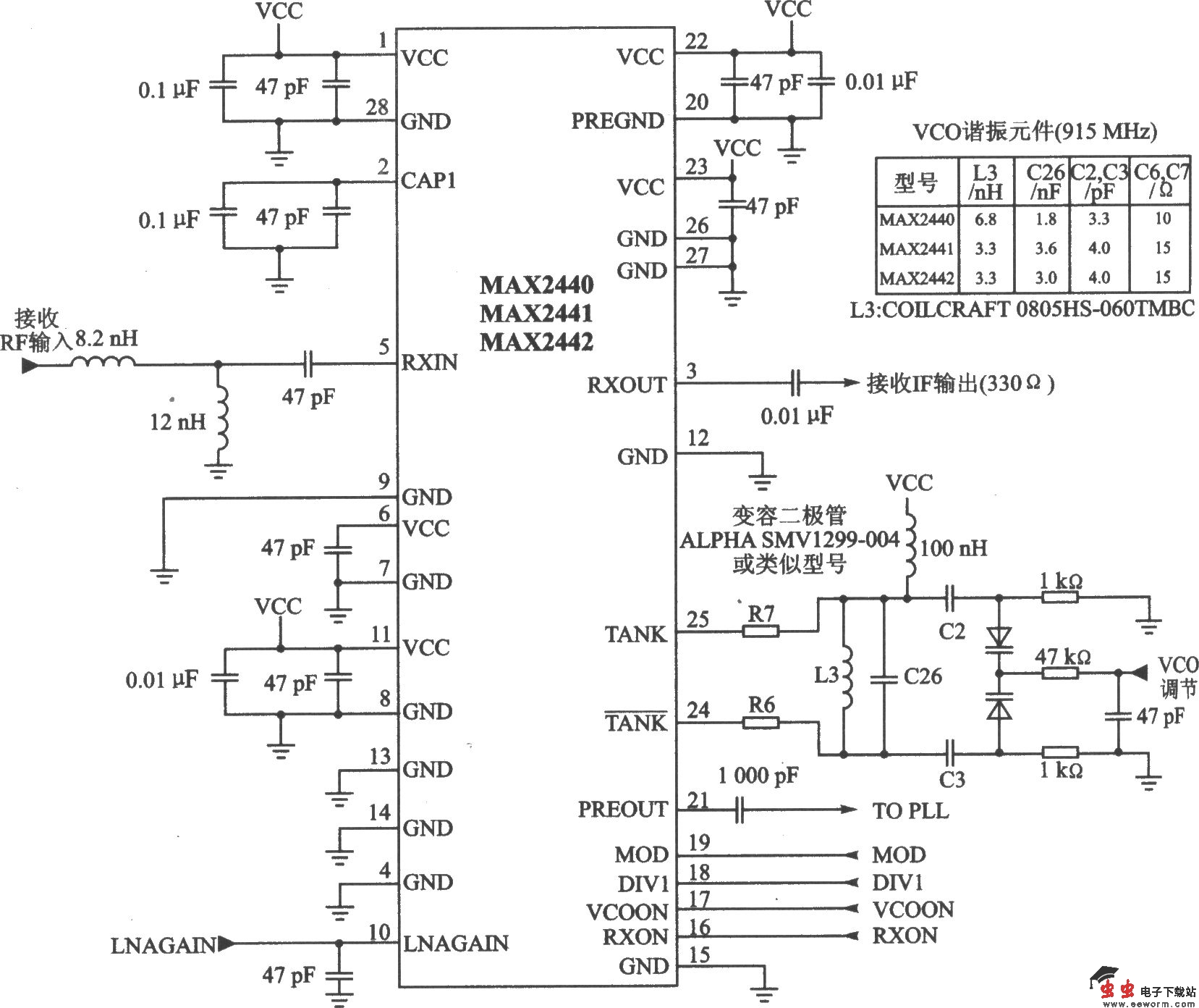 MAX2440/MAX2441/MAX2442是低成本、高集成度前端接收器芯片,用于900 MHz元绳电话和ISM频道。 主要技术特点如下: ·输入频率为800~1000 MHz; ·中频范围:MAX2440为8.5~12.5 MHz,MAX2441为36~55 MHz,MAX2442为 55~85 MHz; ·FSK、BPSK和QPSK解调方式; ·工作电压为 2.7~ 4.8 V; ·接收工作电流为36 mA,待机电流10μA; ·LNA增益可调节,下变频器镜像抑制35 dB。