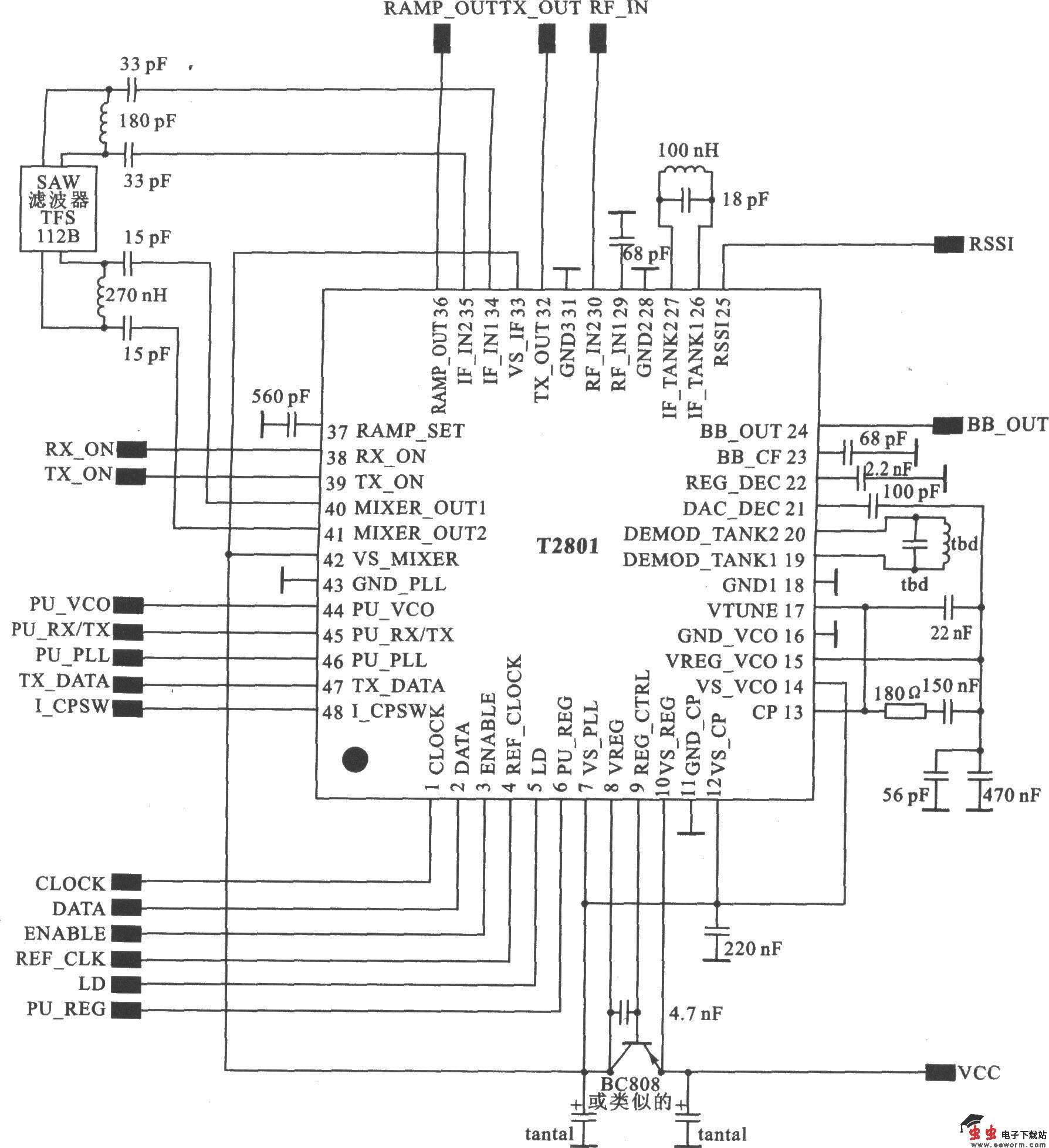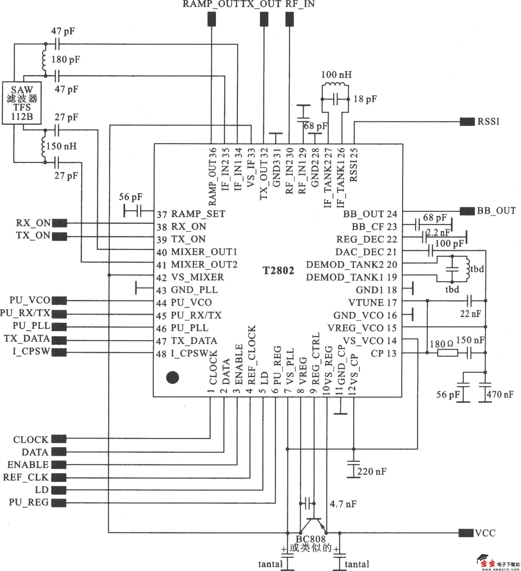 T2801是一款应用在1881~1934 MHz ISM频段的收发器。T2802是一款应用在2400~2500 MHz ISM频段的收发器。 主要技术特点如下: ·电源电压为3.2~4.6 V; ·片内辅助稳压器电压为3~4.6 V; ·发射驱动放大器最大输出功率为3 dBm; ·接收电流为85 mA,发射电流为54 mA,待机电流为l0μA; ·支持多种基准时钟频率(10.368/13.824/20.736/27.648 MHz); ·在生产中不需要机械调谐。