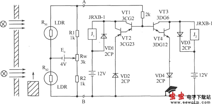将两个阻值和性能差不多的光敏电阻安装在物体运动路径的同一侧,相互间隔适当距离。另一侧相对位置分别安装2个光源,使物体在光源和光敏电阻之间直线运动。采用如图所示电路可以判断物体运动方向。电路由电桥和极性判别两部分组成。Rs1、Rs2、R1、R2和Rw组成电桥,由电源E0供电,A、B端输出。测量前使Rs1和Rs2同时遮光或光照,调节Rw,使电桥平衡。UAB=0V。测量时,当物体由下向上运动时,Rs2首先被遮光,阻值增大,Rs1被光照,阻值较小,电桥失衡,UA>UB,UAB>0V,则VT1、VT2截止,VT3、VT4导通,继电器J1保持断开状态,J2吸合。当物体继续向上运动到Rl位置时,情况相反,J1吸合,J2打开。如果物体由上向下运动,则与上述情况相反,J1先吸合,J2后吸合。因此,根据J1和J2吸合的先后顺序可以判断物体的运动方向,并给出了相应的开关控制信号输出。