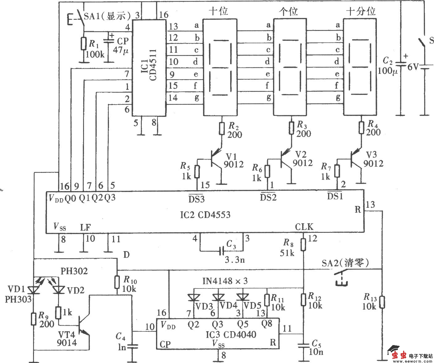 如图所示电路是专门用于对农村中挂在电杆高处的电度表的用电量检查,实际上它仍然是一只数字显示式电子计数器,只是它所显示的数值为电量的单位—“度”,即kW/h。当然,在这里我们并非直接将交流电源输入计数器,而是通过一种变换装置,将用电量转换成电子计数器可以统计的用电量单位而实现的。我们知道,当前所使用的电度表绝大多数仍然采用电一机械式测量和机械式计数器来统计用电量。这种电度表采用一组电磁铁来驱动一个铝盘旋转,由于铝盘的转数(速)与用电量的大小成正比。通过对铝盘转数的统计即可统计出用电量的大小。根据同样原理,用一台电子计数器,通过一个传感器将铝盘的转数记录下来,不也正是用电量数值吗?本电路就是根据这个原理设计和制作的。它的电路如图所示。