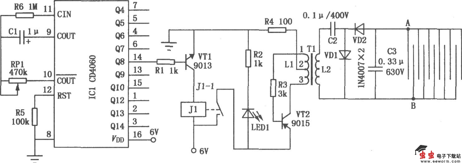 间歇式蟑螂杀灭器的电路如图所示。它主要利用直流高压电来杀灭蟑螂。但由于蟑螂对电场比较敏感,不敢爬上带高压的电网,故电路中的高压采取间歇产生的方式。