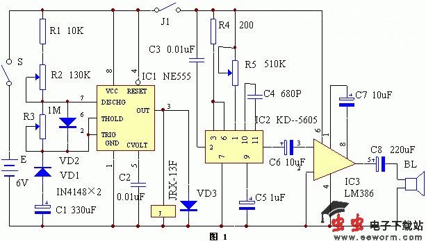 600) width=600; this.height=j/i*600;}" border=0> 编 号 名 称 型 号 数 量 R1 电阻 10K 1 R2 微调电阻 130K 1 R3 微调电阻 1M 1 R4 电阻 200Ω 1 R5 微调电阻 510K 1 C1 电解电容 330u/16V 1 C2、C3 涤纶电容 0.01u 2 C4 瓷片电容 680P 1 C5 电解电容 1u/16V 1 C6、C7 电解电容 10u/16V 2 C8 电解电容 220u/16V 1 VD1、VD2 开关二极管 IN4148 2 VD3 整流二极管 IN4001 1 IC1 时基IC NE555、uA555、LM555、5G1555 1 IC2 猫叫声语音IC KD-5605 1 IC3 音频放大IC LM386 1 J 电磁继电器 JRX-13F 1 S 开关 1 BL 扬声器 1电路焊接完毕,检查无误,便可通电调试。主要是调整间隔猫叫时间,调节R2,使间隔时间为1-3分钟为宜。调节IC2①脚上的可调电阻R5,还可以使猫叫声变调,使其发生恐怖的叫声。其它电路只要焊接无误,几乎不用调试即可正常工作。