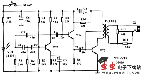 图中变压器T采用晶体管收音机输入变压器。输出电极采用单面敷铜板,剪成直径5cm大小,将引线焊好即可。使用时,可在电极和皮肤之间垫几层湿的纱布。输出脉冲用试探法估计,在调试时可用手触摸电极感到“跳”、“麻”、“胀”时就可以了。每次使用10~20分钟