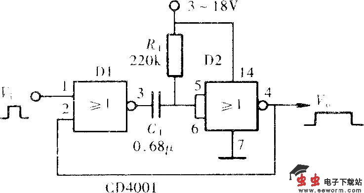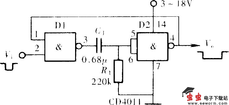 用CMOS与非门或者或非门都可以组成单稳态触发器,这种单稳态触发器在电路中广泛地用于对脉冲信号的延时、展宽和整形等。用门电路组成的单稳态触发器,它的主要原理是利用门电路输入端的阈值电平和加入门电路中的RC元件的充放电作用。用与非门或者逻辑门都可以组成单稳态触发器,但它们各自的触发方式不同,输出的逻辑电平也不同。如图所示为用门电路组成的单稳态触发器电路。