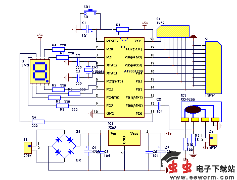 如下图为抢答器的电路原理图,单片机AT90S1200的PB口的PB7~PB2为输入口,接抢答按键开关,当有某个按键按下时,对应口的电位跳低,被单片机检测到并执行相应的程序,比如让数码管显示或者控制音响电路发声等。PD口接数码管,用于显示哪个组抢到,并一数值方式显示出来。PB口的PB0通过电容接到门铃音乐集成电路的触发端,当有某一组抢到时发出声音。电路中,轻触开关SB为复位开关,按下SB,可以让系统复位。当一次抢答完毕以后,只有按下SB,让系统复位,在下一次抢答时,各个组的抢答按键才有用,否则,抢答按键没有作用。