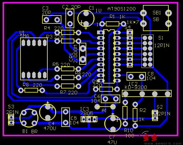 本电路对元件没有什么特殊要求,按照图中标明的型号选用即可。电路中R10的数值由自己定,要求是使音乐片正常工作即可,因为音乐片并不是一直在工作,因此,我在制作时把R10省了,也不怎么样。音乐片采用叮咚门铃音乐片,要注意在音乐片上焊上一个NPN型三极管(三极管在图中我没有画出来),比如9013。注意要在稳压集成电路7805上加上散热片。