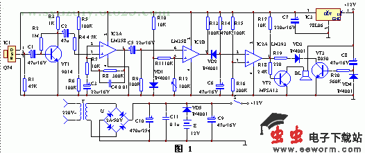 再通过C2 输入到运放IC2 (lm358)中进行高增益、低噪声放大,此时由IC2①引脚输出的信号已足够强。IC3 (lm358)作电压比较器,它的第⑤引脚由R10、VD1 提供基准电压,当IC2①引脚输出的信号电压到达IC3 的⑥引脚时, 两个输入端的电压进行比较,此时IC3的⑦引脚由原来的高电平变为低电平。IC4(lm358) 为报警延时电路,R14 和C6 组成延时电路,其时间约为1 分钟。当IC3 的⑦引脚变为低电平时,C6 通过VD2 放电,此时IC4 的②引脚变为低电平, 它与IC4 的③引脚基准电压进行比较,当它低于其基准电压时,IC4 的①引脚变为高电平,VT2 导通,讯响器BL 通电发出报警声。人体的红外线信号消失后,IC3 的⑦引脚又恢复高电平输出,此时VD2 截止。由于C6 两端的电压不能突变,故通过R14 向C6 缓慢充电,当C6 两端的电压高于其基准电压时,IC4 的① 引脚才变为低电平,时间约为1 分钟,即持续1 分钟报警。