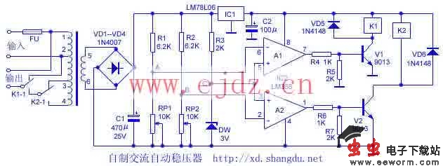市电从变压器的1、2头输入,3、4头为自耦调压抽头,5、6头为控制电路的电源及取样抽头。市电电压正常时,因C点电压始终为3V(即R1降压DW稳压所得),A、B点均大于3V,故A1、A2(lm358芯片)输出低电平;当市电电压下降时,5、6头的电压也随之下降,A点电压也跟着下降,当A点电压下降到低于3V时,A1输出高电平,使三极管V1饱和导通,继电器K1吸合,将调压器输出调于1、3头;当市电电压继续下降时,同理B点电压低于3V时,(VA 反之,如果电压升高时,B点电压也随之升高,当B点电压高于3V时,A2输出低电平,V2截止,H2释放,输出端调至1、3头;当市电电压继续升高时,A点电压高于3V,A1输出低电平,V1截止,K1释放,输出端调至1、2头。A1、A2为运放,在这里作电压比较器用;IC1为三端稳压块,它为运放及继电器提供供电电源;VD5、VD6为保护二极管。