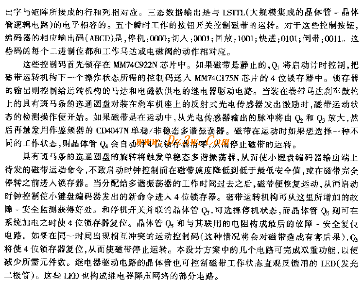 MM74C922N原来设计用来进行检测、去颤抖和给 16 键的开关矩阵编码的,而它却包含了为全功能的磁带运转控制电路(图 200)所需的大部分元件。这个集成电路芯片可代替超过九个 CD4000型的触发器和随机逻辑电路芯片,并可提供除运动检测电路以外的各项功能。 MM74C922N芯片可提供卷带、倒带和放音功能。它的简单的外部电路可提供磁带的运动检测功能。具有检测磁带运动功能的运转机构在磁带上的作用力很小,因而可以不用停机就可使磁带机改变工作状态。轻松的磁带编辑和装磁带所需的切人/加载功能在本机型中几乎都是免费提供的。这样,其成本的增加,只是增加一个开关而已。