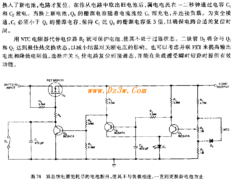 能将电池与负载断开的固态继电器电路图 图 74 所示的电路使用了一种低阻值 P 沟道 FET (场效应晶体管)Q1,当电池的电压低于一定值时,将负载与电池断开,这种断路状态一直保持到更了新电池为止。Q1的最小阈值决定了电路中电他电压的最低工作电压,对于大多数 IET 来说,这最低的电池电压为 5V 。
