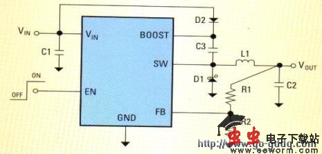 在图1右边电路中,DC/DC稳压器的FB是高阻输入端,流经LED的电流IF为:IF=VFB/RFB (2)