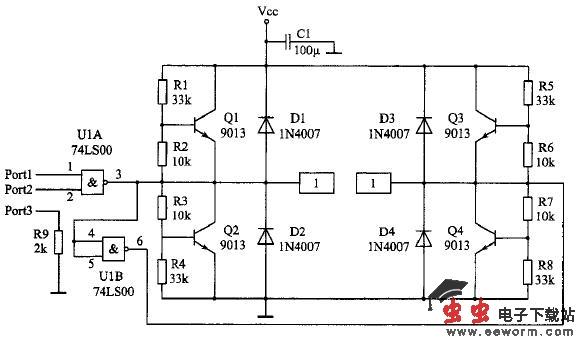 笔者经过长期实验,得到一种可调速的双向直流电机驱动电路,电路如附图所示。