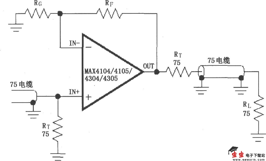 如图所示为由MAX4104/4105/4304/4305构成的视频电缆驱动放大电路。MAX4104/4105/4304/4305适用于作为同轴电缆传输线放大视频信号,为了使传输过程反射最小,负载上获得最大功率,选择放大器输出阻抗与终端阻抗等于传输线特性阻抗(75Ω)。该电路中,MAX4104/4105/4304/4305起中间放大作用,将电缆输入的视频信号放大后输出,由电缆线继续传输。