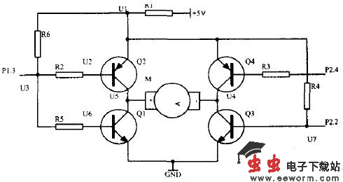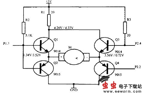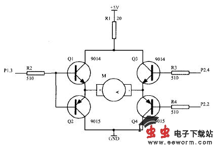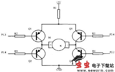 如图1所示.P1.3、P2.2和P2.4分别是51单片机的I/O引脚。原设计的工作原理是:当P1.3高电平、P2.2和P2.4都为低电平时,Q1和Q4导通,Q2和Q3截止,电流流向为+5V→R1→Q1→M→Q4→GND,电动机正转;当P1.3低电平、P2.2和P2.4都为高电平时,Q2和Q3导通,Q1和Q4截止,电流流向为+5V→R1→Q3→M→Q2→GND,电动机反转;当P2.2为高电平,P2.4为低电平时,P1.3不管是高电平还是低电平,电动机电路不通,电动机不转。