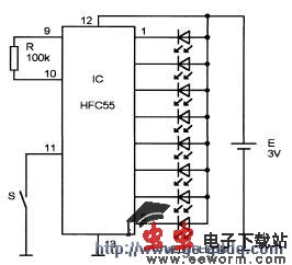 由HFC55构成的直流闪光玩具控制电路原理如图所示。R是HFC55的外接振荡电阻,它的阻值大小确定其发光二极管LED1~LED8的顺序流水速率。S是启动与停止控制键,按动一次,IC的(11)脚就对地触发一次,从而可以控制彩灯的工作与停止。整个电路采用两节5号电池供电、可用作玩具装饰等。