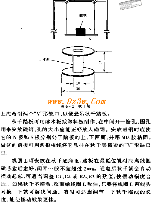 三极管VTl、VT2组成自激多谐振荡器,由于电容Cl、C2轮流充电和放电,使得VT1,VT2轮流交替导通和截止。当VT2截止时,VT2集电极输出高电平,VT3获得基极偏流导通, LED 通电发光,同时线圈L也有电流通过。只要线圈L两线头接线正确,就能使线圈L上端形成 N 磁极,这个磁极与秋干踏板上磁钢下端磁极相同,由于同性相斥产生推斥力,就使秋千踏板被推往高处,然后VT2由截止变为导通,VT2集电极输出低电平,VT3 截止, LED 熄灭也没有电流通过线圈L,磁场也就消失。当踏板上升到一定高度时,又会在重力作用下向相反方向摆回,刚越过线圈L的上方时,VT1与VT2又导通与截止,使线圈L上端再次形成 N 磁极,踏板又被推斥,就这样周而复始,使踏板周期性地往返摆动,好像永动机一样。