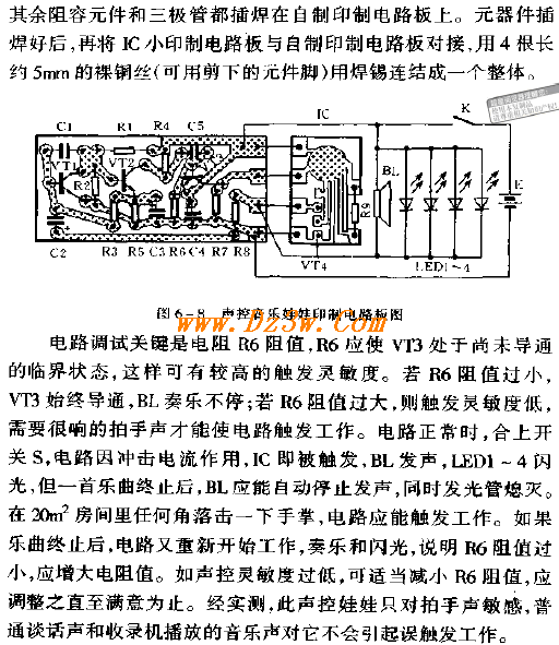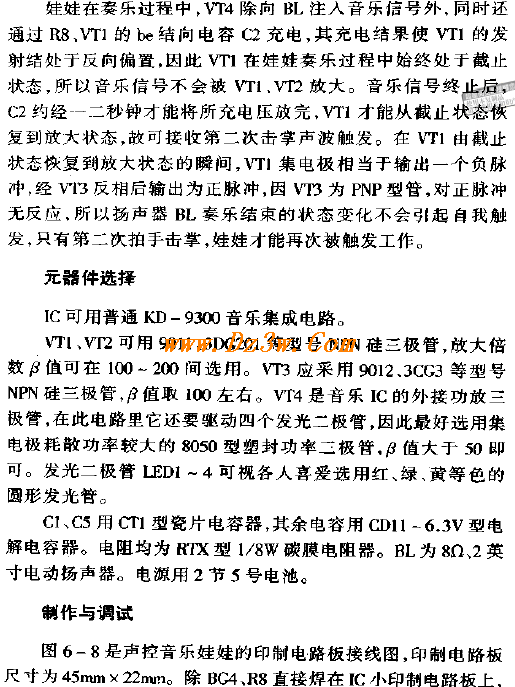声控音乐娃娃是一个装饰性很强的小摆设,当你拍一下手掌,娃娃就会鸣奏一首电子乐曲,同时镶嵌在娃娃衣裙里的彩灯能发出和乐曲同步的闪光,十分有趣和讨人喜欢。该娃娃电子线路的一个显著特点是它的声波接受器和发送器是同一个扬声器,这就消除了一般声控音乐玩具的受话器(话筒)和送话器之间相互干扰问题。