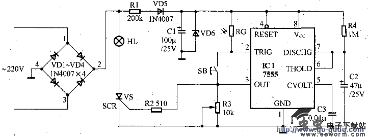 此电路由二极管VD1~VD4组成桥式整流电路,再经R1限流,C1滤波,VD6稳压获得10V直流电压,为7555定时器提供电源。7555定时器和R4、C2构成单稳态触发器。暂稳态持续时间T=1.1R4C2=50(s)。