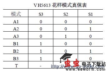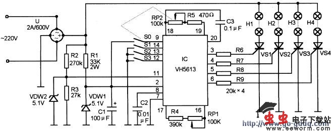 由VH5613构成的四路彩灯串控制电路原理如图所示。220V市电经全桥U整流后,由电阻R1限流降压,电容器C1滤波,VDW1将其电压稳定在5.1V供给ICVH5613工作。由电阻R2、R3构成1/10分压器,由VDW2将其电压稳定在5.1V供给IC作信号同步输入。R4、RP1、R5、RP2构成的振荡电路可以通过调节RP1、RP2的阻值来调速、调光。S1、S2、S3可组合(高电平1及低电平0)成不同花样功能,如表所示。其模式的具体花样如下:模式A1:前进循环;模式A2:进退循环。前进20步之后改为后退;后退20步又改为前进。如此循环。模式A3:复合循环。先以4种速度前进,接着又以4种速度后退,其速度从高至低。模式B1:非闪烁调光。四路彩灯串均从暗变到全亮后,再从全亮又变暗。模式B2:进退循环调光。四路彩灯串顺序由暗变到全亮后,再由全亮变到暗,每4次后改变其循环方向。模式B3:复合循环调光。四组彩灯串中的任意两组相邻的灯串从暗变到全亮后,再从全亮变到暗,并顺序循环。每循环4次改变其循环方向。模式T:触发模式。IC依次改变如上述的6种花样,每种花样的持续时间约为20s。用户亦可利用SO来选择工作模式,如果将SO接VDD(即闭合)即固定了当前所处的工作模式。