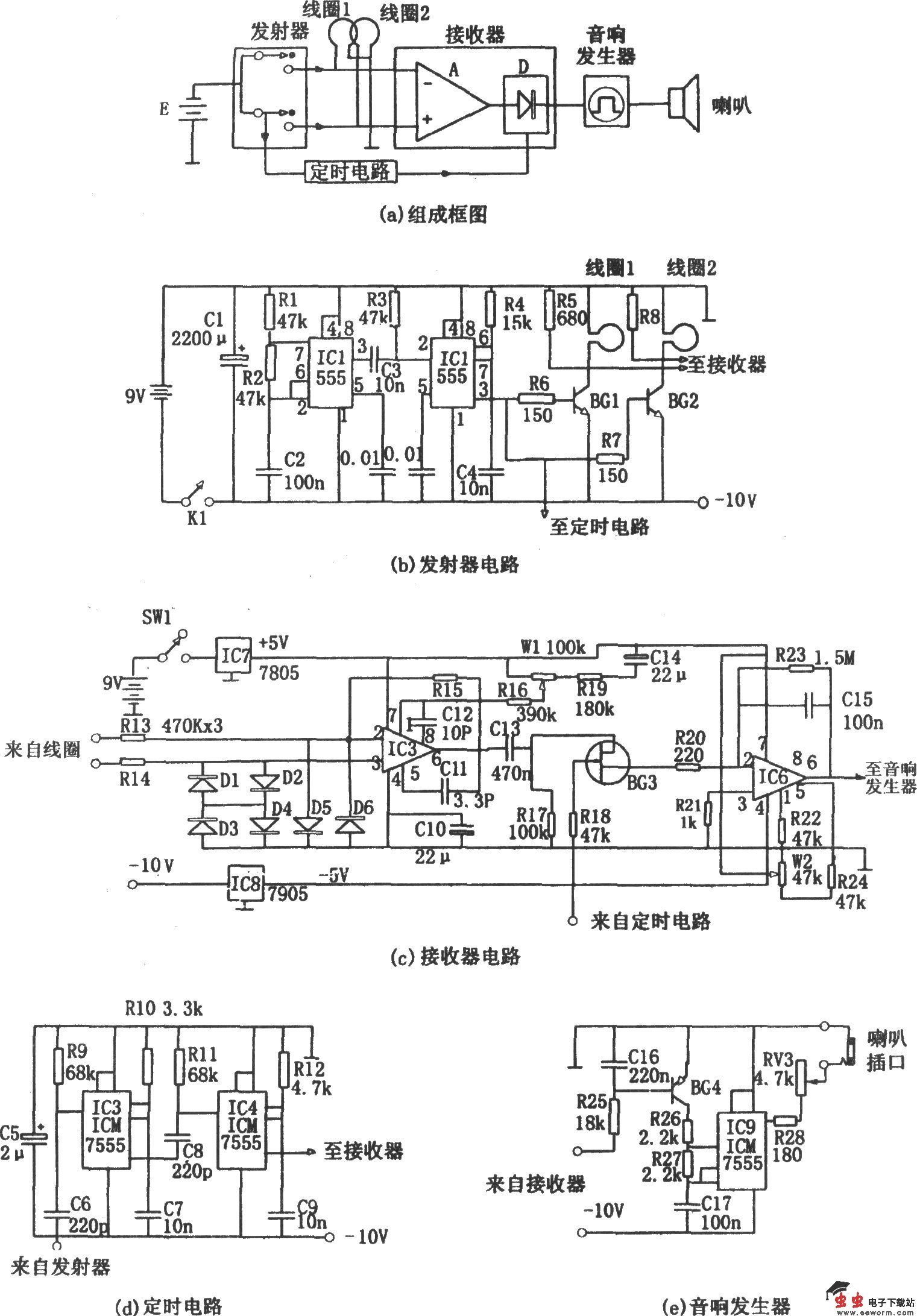 音响发生器如图(e)所示,核心是由555(IC9)、BG4、R26、R27、C17等组成的多谐振荡器。当无金属感应信号时,由IC6⑥脚输出的信号使BG4截止,多谐振荡器不工作,相应喇叭不发声。当有金属感应信号,且搜索线圈逐渐向金属体靠近时,感应信号变大,则BG4的导通状况变好,从而使IC9的振荡频率逐渐增高,当接近金属体时,由IC9输出的高频振荡信号便驱动喇叭发出高频音响,表示此处有金属物体。