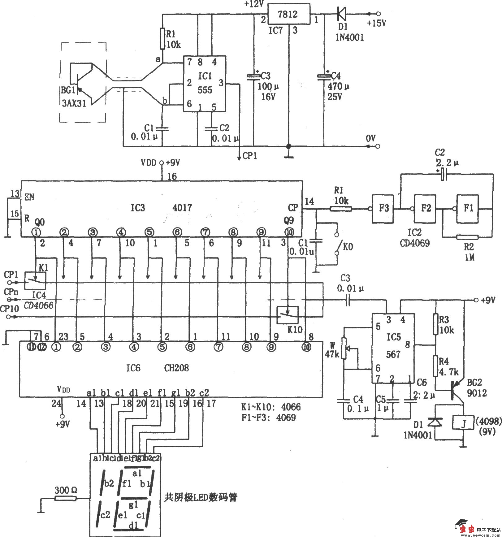 电路中IC2采用六反相器CD4069,其中F1、F2、F3组成0.2Hz的触发脉冲发生器,即每5秒向计数电路IC3送一个计数脉冲CP。IC3为十进制计数器/脉冲分配器CD4017,在CP作用下,其十个输出端Q0~Q9依次出现高电平脉冲。相应使模拟电子开关K1~K10依次导通。模拟开关IC4采用CD4066,由K1~K10输出的频率信号依次送入具有锁相环回路的音频译码器IC5(567)③脚(其中IC5的中心频率为f0=1/1.1RwC4,电路中的C5可调定锁定带宽),当某一路温度超过限定范围,且与预置的中心频率f0相同时,则IC5输出低电平(自⑧脚),使BG导通,继电器J吸合,触发报警电路工作,发出报警葸响。与此同时,IC3的Q0~Q9输出的高电平信号又依次送入IC6(CH208)译码显示电路,经IC6译码后输出相应的字段信号,驱动共阴极数码管LED工作,使其显示出相应的超温场点。