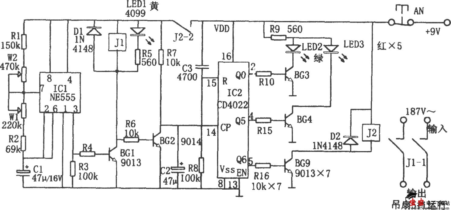 由IC1(555)和R1、W1、W2、R2、C1组成的多谐振荡器的振荡频率为,f=1.44/(R1 2Rw1 Rw2 2R2)C1,其频率和占空比可通过调节W1、W2来改变。当555③脚输出高电平时,BG1导通,继电器J1吸合,触点J1-1闭合,从而控制电扇的运转。同时BG2截止,向IC2的CP端输入坐个高电平。