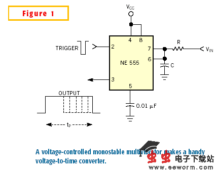 图1 用压控单稳态多谐振荡器制作便捷的电压-时间转换器。