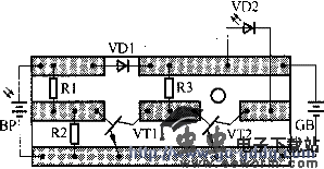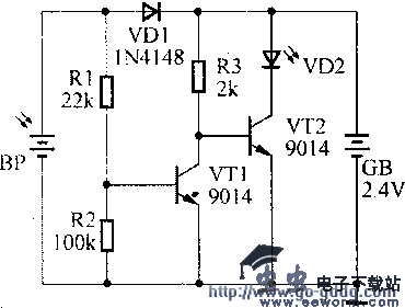 它由太阳能电池板BP、镍氢电池GB、超高亮度发光二极管VD2以及晶体三极管VT1、VT2等构成的光控开关电路组成。
