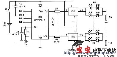 调节RP可以改变发光二极管群的闪烁速率。IC7161P的基本花样只有六种:(1)弹性张缩;(2)全亮间隔闪亮;(3)向左倒流水;(4)向右顺流水;(5)向右依次亮,同时熄;(6)同时亮,向左依次熄。但通过对IC的B1、B2、B3、B4与VDD、VSS的不同连接可以产生20多种有趣的花样变化。