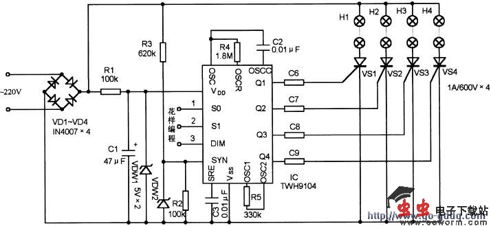 由TWH9104IC构成的四路100W彩灯串控制电路原理如图所示。它是由电源电路、控制集成电路TWH9104及无触点开关等组成。220V市电经二极管VD1~VD4整流,由电阻R1限流降压后,VDW1将其电压稳定在5V,C1滤波后供给整机电路工端,经电阻R3限流降压,VDW2将其稳定在5V加至IC的SYN端。OSC1、OSC2为调光速率振荡端,由外接电阻R5的阻值确定。OSC、OSCR、OSCC为彩灯串追逐速度振荡端,由外接R4及C2的数值确定。Q1~Q4为四路彩灯串输出端,可驱动四只单向可控硅带动四路彩灯串作花样变化。S0、S1、DIM为三端花样编程,可以在这三端上安装3只1×2小型拨动开关,这样就可以随时改变其变化花样。
