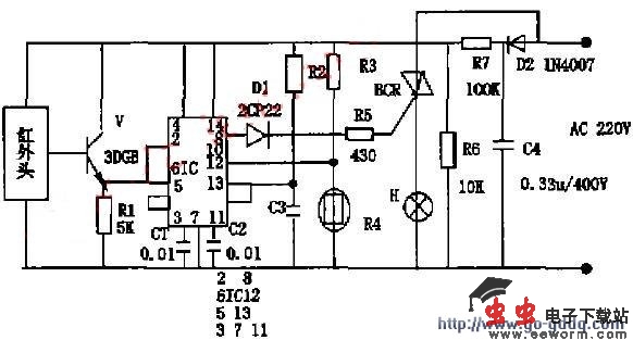 灯控器电路R2 c3根据定时确定R3由调试确定图4为灯控器的完整电路 220V交流电压经D2半波整流,c4滤波,R6、R7分压后给开关电路供电。R3、R4组成光控电路。白天,R4(光敏电阻)呈低阻,IC控制端为低电乎,其输出端始终为低电乎,双向晶闸管BCR截止。晚上,R4呈高阻,Ic控制端为高电平,当红外接收头检测到人体辐射出的红外线时,Ic输出高电平,双向晶闸管BCR导通,灯H被点亮 定时到后,Ic输出低电平。BCR截止。当人一直在红外接收头检测范围内活动时,灯可连续点亮,这点它优于声控器 另外,它无误动作,不像声控只要有响声就点亮,此时可能并不须要点亮。