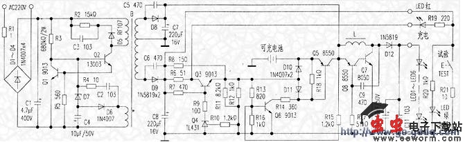 在C7、C8上产生的两组直流供电电压,+2.8V电压为LED照明之主用电源;该电压直接供给Q7-Q8等组成的超音频振荡器电路;由于振荡和电感E自感作用,由D12输出后可在C1O、C11上形成约+18V直流电压,供LED1~LED6灯组发光。+6V电压则主要是为可充电池的充电电路提供电源。此电压首先供给由Q3管和Q4精密稳定源组成的恒流恒压型充电电路(恒流与恒压充电量分别出R6和R11或R12的电阻参数确(定)。