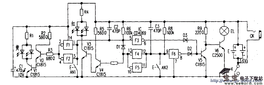 该灯主要由六非门电路CD4069和V1~V6三极管等构成。 由两节18650锂电池供电。闭合开关K照明灯EL自动点亮。按复位开关AN1后,非门电路F的②、③、⑥脚置为高电平,V1、V2导通黄灯点亮:V5导通V6截止照明灯熄灭。按AN2时非门电路12、11、⑧脚被置为高电平V4、V3导通红灯点亮:V5导通、V6截止,照明灯不亮。同时非门的②、③被置为低电平,V2、V1截止关闭黄灯。
