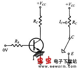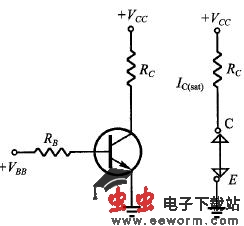 图一所示是NPN三极管的共射极电路,图二所示是它的特性曲线图,图中它有3 种工作区域:截止区(Cutoff Region)、线性区 (Active Region) 、饱和区(Saturation Region)。三极管是以B 极电流IB 作为输入,操控整个三极管的工作状态。若三极管是在截止区,IB 趋近于0 (VBE 亦趋近于0),C 极与E 极间约呈断路状态,IC = 0,VCE = VCC。若三极管是在线性区,B-E 接面为顺向偏压,B-C 接面为逆向偏压,IB 的值适中 (VBE = 0.7 V), I C =h F E I B 呈比例放大,Vce = Vcc -Rc I c = V cc - Rc hFE IB可被 IB 操控。若三极管在饱和区,IB 很大,VBE = 0.8 V,VCE = 0.2 V,VBC = 0.6 V,B-C 与B-E 两接面均为正向偏压,C-E间等同于一个带有0.2 V 电位落差的通路,可得I c=( Vcc - 0.2 )/ Rc ,Ic 与 IB 无关了,因此时的IB大过线性放大区的IB 值, IchFE IB 是必然的。三极管在截止态时 C-E 间如同断路,在饱和态时C-E 间如同通路 (带有0.2 V 电位降),因此可以作为开关。控制此开关的是 IB,也可以用 VBB 作为控制的输入讯号。图三、四分别显示三极管开关的通路、断路状态,及其对应 的等效电路。