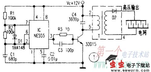 下时)其基极为0电平,T01处于截止状态。当遥控器的某一按键被按下时,ICl的(17)脚输出代表该按键数据的编码脉冲信号,此编码脉冲既为T01提供直流偏置,又同时对TOI产生的高频信号进行调制。L00为线路板印制的电感,既和C03、C04组成谐振回路,决定发射器的射频频率(260MHz~320MHz),又是发射器的负载——天线。BATT为一节12V G23A型电池,由D01和D02降压后产生约6V电压加在按键矩阵电路上,其中D01兼作发射指示灯;发射器在平时几乎不耗电,因此未设立电源开关,一节G23A电池可以使用半年以上。遥控接收控制电路由高频放大、超再生信号检波、信号放大整形、数据解码及高压延时驱动等电路组成。从天线TA拾取的发射器信号经C2耦合到场效应管K1的栅极,经K1进行放大后由C3耦合到超再生检波器。超再生检波器由V1、L3、C8、C7等元件组成,完成对高频信号选频、放大及数据检波。L3、C8选频回路的谐振频率和发射器的频率相同。由超再生检波级输出的数据信号经C9、L5、C10组成的低通滤波器滤去高频信号后,再由IC2两级运算放大器进行放大整形,输出符合解码芯片TWH9257识别要求的数据信号。平时解码IC3的(17)脚均低电平,V5截止,继电器常开触点不吸合,高压电击模块不工作。高压电击模块为一体化结构,采用环氧树脂灌封,只要输入端接通电源,输出端就有高压脉冲产生。当IC3的14)脚收到运放输出的数据信号,并且其地址编码与发射器的地址:编码完全——致时,IC3的(17)脚输出高电平,V5导通,继电器J常开触点闭合,高压模块得电工作。当发射器信号
