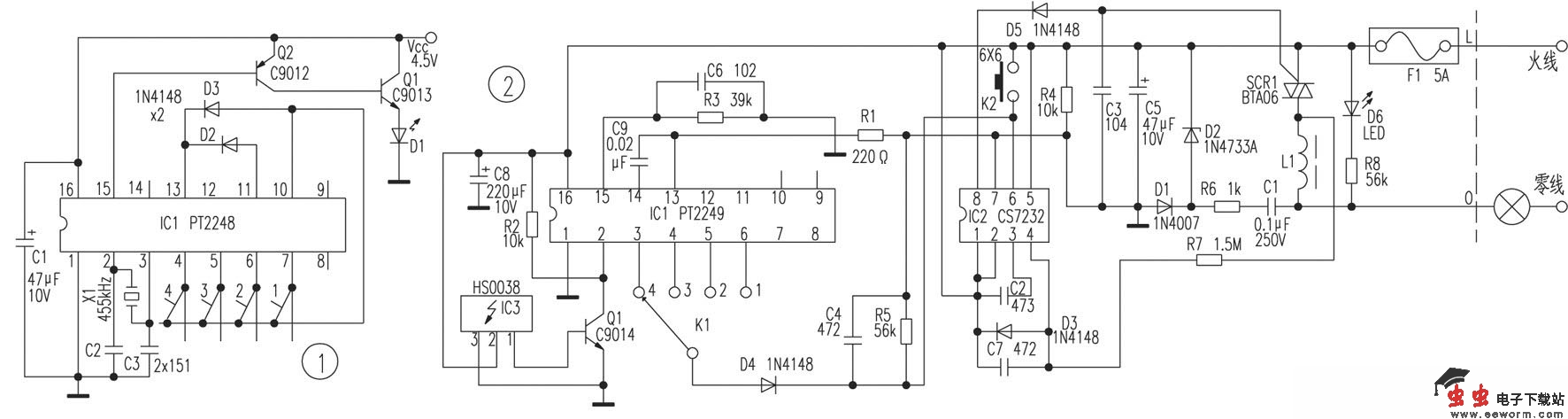 1. 遥控发射电路。发射电路见图1。它由通用红外编码遥控发射集成电路PT2248组成。其振荡端已内附500kΩ电阻,只需外接陶瓷滤波器或LC串联谐振电路便能产生振荡使电路工作,图1中X1为455kHz陶瓷滤波器。PT2248的~脚、~脚构成键盘矩阵,本遥控开关只用了其中的四个键,并标有数字1、2、3、4,分别控制四只接收器。控制信号由脚输出,经Q2、Q1放大后驱动红外发射二极管D1向外发射遥控信号。