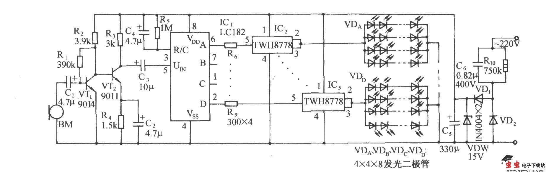 电路如图所示。它包括拾音信号放大器、LC182灯控电路、功率驱动开关电路、多色发光二极管和交流降压整流电路等。