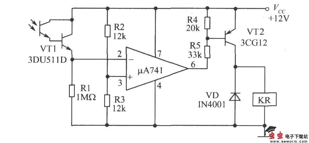 如图所示电路采用了达林顿型光敏三极管和运算放大器,所以很微弱的光线即可使电路翻转。当把R1和光敏管的位置对调,或且将运算放大器的反相和同相输入端对调位置,就可以把该电路修改为暗触发开关。