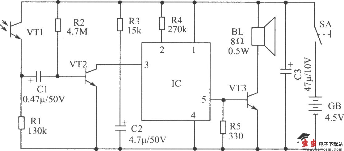 如图所示语言电路是用光敏三极管进行光控的。它由光控开关和35语音集成电路两部分组成。图中光敏三极管VT1和晶体三极管VT2,电阻R1、R2、R3和电容C1、C2等构成光控开关电路。语音集成电路IC及三极管VT3、电阻R4、R5等构成语音放大电路。平常在光源照射下,VT1呈低阻状态,VT2饱和导通,IC触发端3脚得不到正触发脉冲而不工作,扬声器无声。当VT1被物体遮挡时,便产生一负脉冲电压,并通过C1耦合到VT2的基极,导致VT2进入截止状态,IC获得一正触发脉冲而工作,输出音频信号通过VT3放大,推动扬声器发出声响。声响内容可根据不同场合选择不同的语音电路来产生,例如高压电网或配电房等场所,可选用“高压重地,禁止人内”、“有电危险,请勿靠近”等语音集成电路。