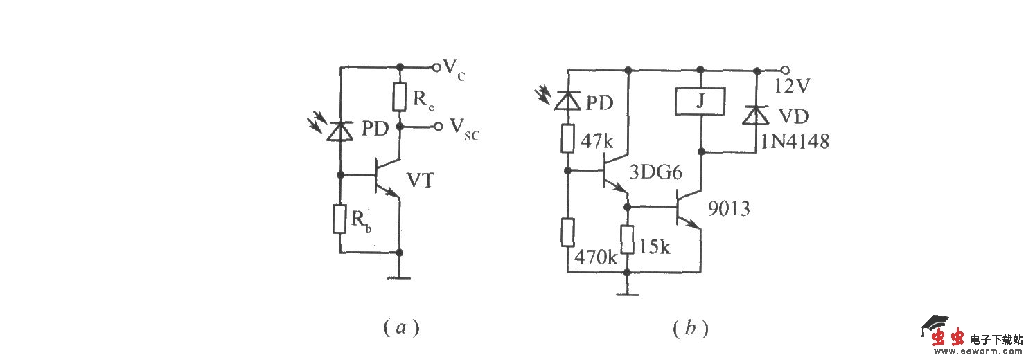 如图所示,(a)图为光敏二极管组成的光信号放大电路;(b)图为光敏二极管组成的开关电路。