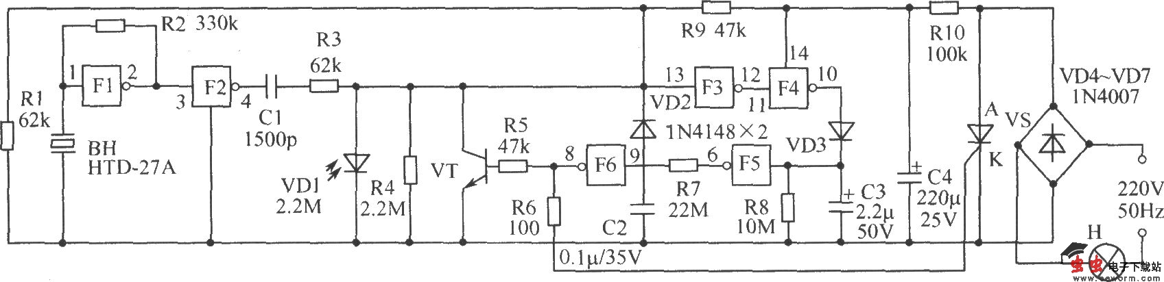 如图所示为节电的走廊灯电路,它由整流电路(二极管VD4~VD7)、降压与滤波电路(R10与C4)、受控照明灯H的控制开关VS(VS导通,H亮;VS关断,H熄灭)、光控电路(由光敏二极管VD1、反相器F3、F4、F5与F6以及三极管VT组成)、声控电路部分(由声-电转换压电陶瓷片BH、反相器F1、F2、F3、F4、F5与F6以及VD3、C3、R8组成)等组成。