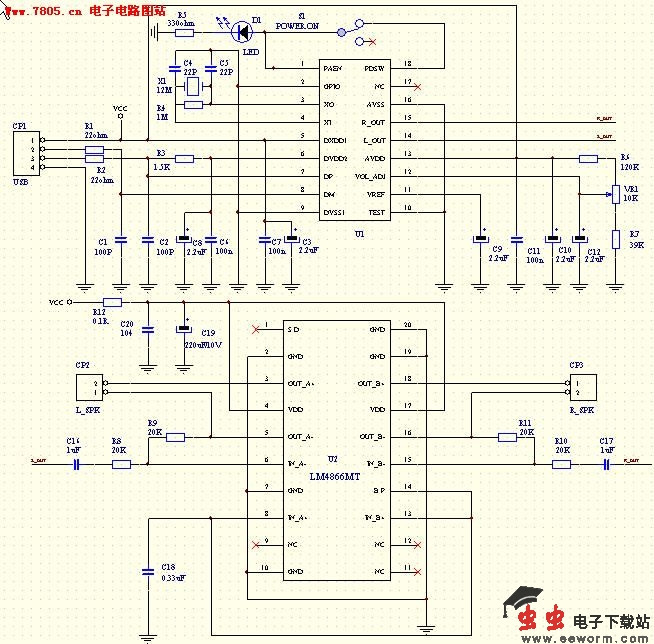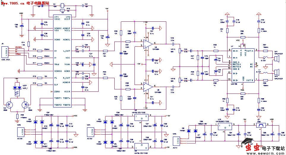 2,HI-FI级 USB AUDIO PCB,采用高品质USB AUDIO DAC 芯片,用两颗OPA604构建LPF,推动LM4766输出2x40W功率。三部分电源由独立AC-DC整流滤波。
