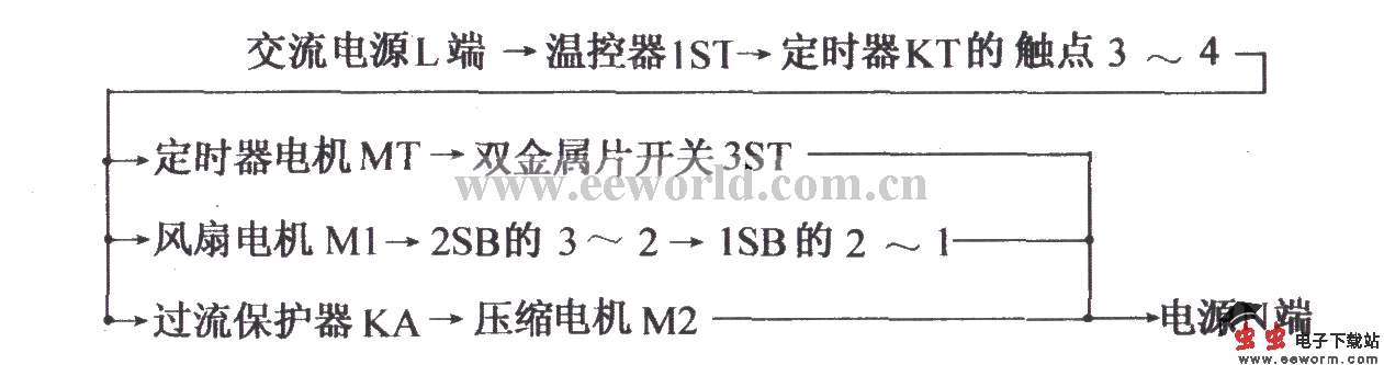 华凌BCD182型电冰箱控制电路如图所示。按钮开关1SB、2SB分别由电冰箱的冷藏室门、冷冻室门控制。门关上时,按钮开关闭合,开门则断开。当电源接通时,定时器电机MT、风扇电机M1和压缩电机M2得电工作。电冰箱开始制冷。其电流回路是: